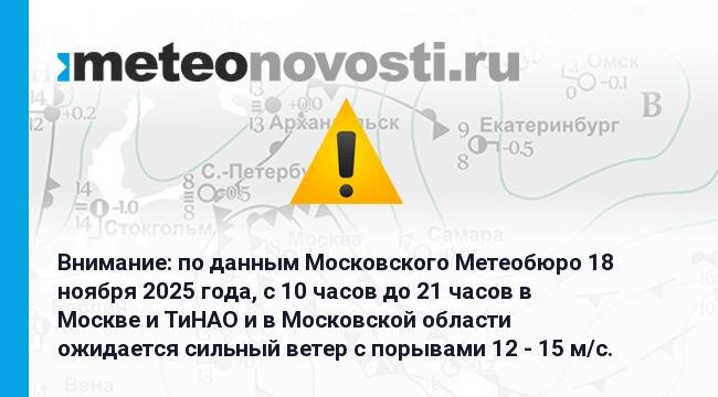 Внимание: по данным Московского Метеобюро 18 ноября 2025 года, с 10 часов до 21 часов в Москве и ТиНАО и в Московской области ожидается сильный ветер с порывами 12 - 15 м/с. Перейти на сайт Прогноз погоды на 14 дней