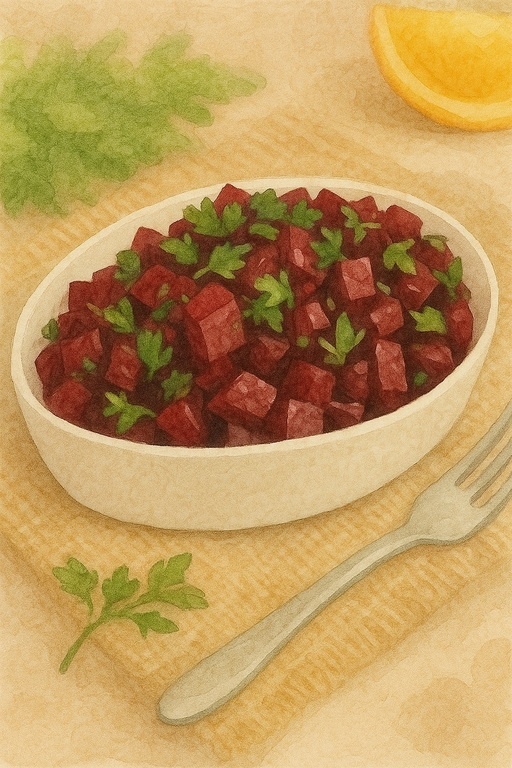Яркий свекольный салат с орехами и травами Этот салат из запеченной свеклы – настоящий подарок для тех, кто ценит простоту, пользу и невероятный вкус. Сочетание сладковатой, ароматной свеклы, пикантного чеснока, свежей кинзы и хрустящих грецких орехов создает гармоничную палитру вкусов и текстур. Запекание придает свекле особую нежность и раскрывает ее натуральную сладость, а пряные травы и ароматная заправка делают этот салат незабываемым. Он идеально подходит как легкий гарнир, самостоятельное вегетарианское блюдо или яркое дополнение к праздничному столу. Ингредиенты для салата Для приготовления этого ароматного салата вам понадобятся: Свекла 1 кг Чеснок свежий 4-5 зубчиков Чеснок сушеный 1 чайная ложка (по желанию) Растительное масло 4 столовые ложки (оливковое или подсолнечное без запаха) Прованские травы 1-2 чайные ложки (или по вкусу) Соль по вкусу Перец черный молотый по вкусу Кинза свежая 1 большой пучок (для заправки и украшения) Грецкий орех 50-70 г (или по вкусу) Уксус
