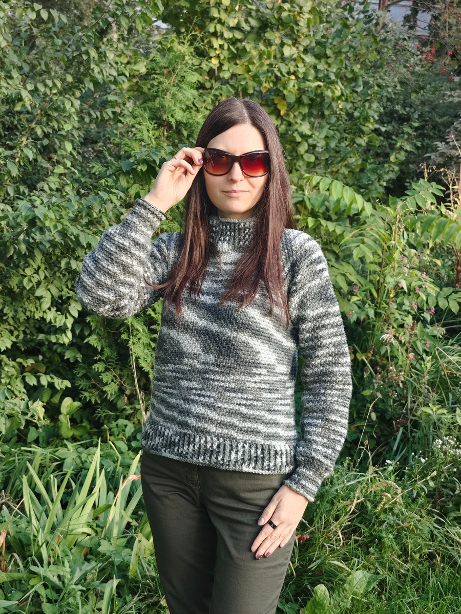 Давно постиков не было, да? Чтож, ловите свитерочек! Я перевязала его полностью О.О Все верно вы подумали, я абсолютно законченный свитер распустила и перевязала. Тот свитер получился весьма дубовеньким и вышло так, что рукава уж очень узкими вышли. Их можно было отдельно перевязать т.к. свитер вязался в поперечке, но я решила "все херня, давай с начала". В итоге получился свитер на много лучше и мягче. Уже тестила его в ветренную погоду, поэтому могу с уверенностью сказать, что он и очень теплым вышел и не продуваемым почти (с курткой совсем не продувает). Теперь о техническом Пряжа акрил 100%. Вязала крючком 4,5мм (прошлый вязала крючком 3мм). Основной узор это СБН за переднюю и заднюю стенку петли поочередно. Воротник и нижний край сделан резинкой из ССН. Манжеты чтоб не были толстыми я не стала делать резинкой ССН и оставила таким же узором, как основное полотно. Вязала регланом сверху вниз. В результате свитер мне нравится и он явно лучше того первого! На осень без футболки\майки