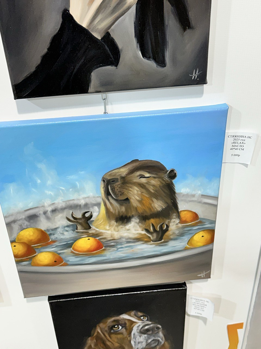 Доброе утро, мои замечательные друзья! Смотрите, какую капибару я вчера нашла. Мы с Серёжей в кино ходили, "Иллюзия обмана 3". Не разочарованы, но и не было того восторга как от первой части. Были в Veer Mall, мягкий кинотеатр. Очень понравился кинотеатр, даже жующие не смущали, народа было не очень много, мы на 21:35 ходили. Перед сеансом было немного времени, совсем мало. Прогулялись по небольшой галерее, капибара оттуда, ещё есть фотографии представленных картин, неудобно было фотографировать, там люди ходят. Девочка рисует, четырнадцать лет. Прелесть просто. А это другая художница. Неужели я мимо пройду? Смотрите какое очарование. А вот... Я в ту дверь не пошла, ну его...Непонятно куда попасть могла бы. У Серёжи тоже был набор шуршуна, но мы сидели одни в ряду. И он сгрыз всё до начала сеанса, неправильный киноман ,Сергей Владимирович. А это моё. Я даже не спала! А в таком то кресле, грех не вздремнуть. До дома мы добрались в пол второго ночи. В общем отдых прошёл неплохо,