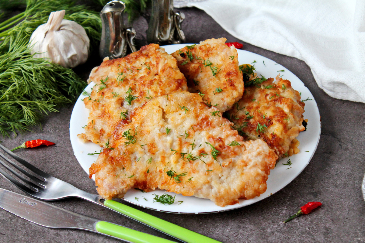 Рецепт сочных и нежных отбивных из свинины с луком на сковороде: Ингредиенты (на 4–5 порций): Приготовление: Для отбивных лучше использовать кусок ошейка, не очень жирный, с плотной мякотью. Можно также взять корейку или антрекот, но они должны быть с прослойками жира — так будет сочнее.