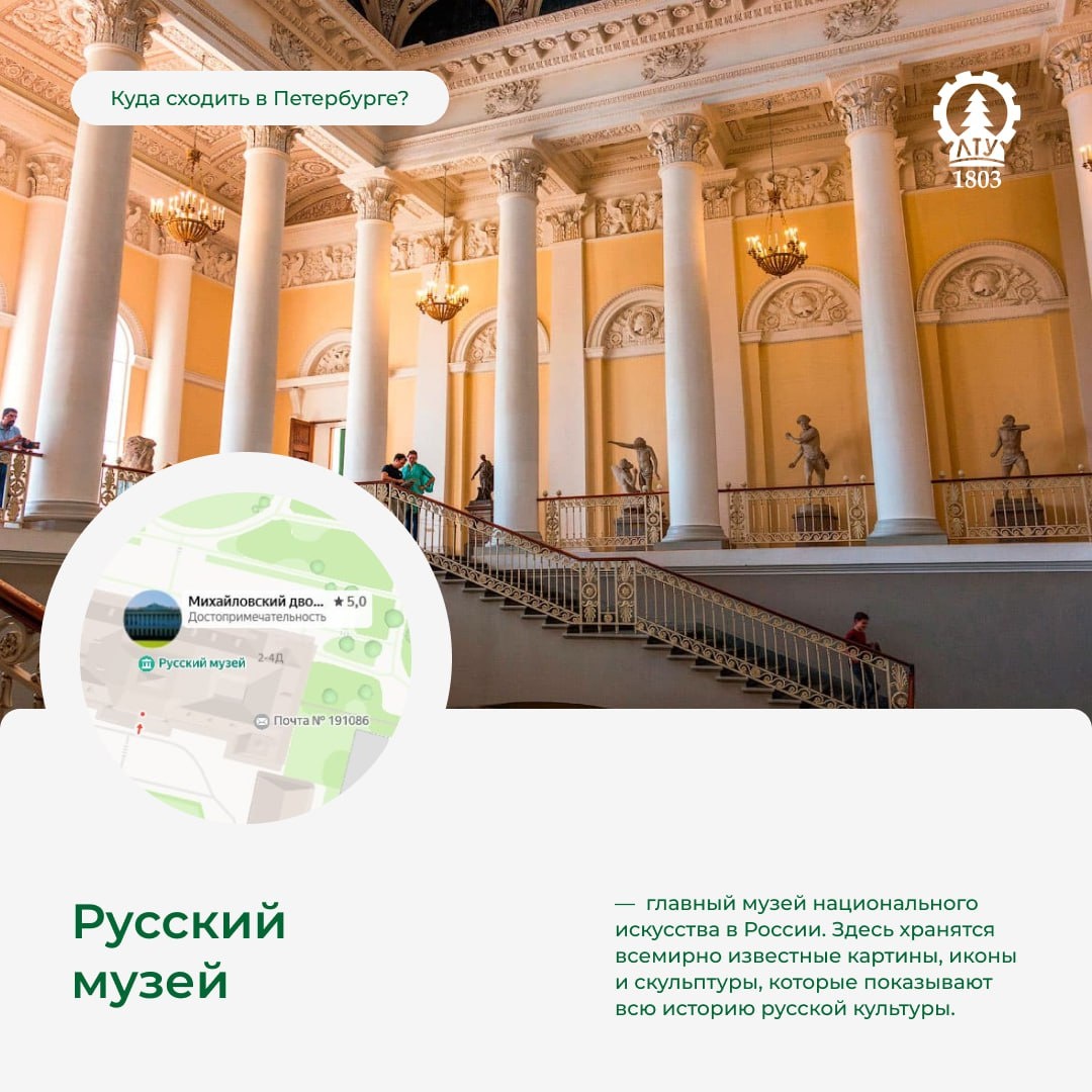 Доброе утро, друзья 🐱 🏛 Сегодня в рубрике «Куда сходить в Петербурге?» рассказываем о Русском музее — месте, где оживает вся история русской живописи. Русский музей — это не просто галерея, а огромный культурный центр, в котором собраны лучшие произведения отечественных художников от икон до авангарда. Здесь можно увидеть шедевры Айвазовского, Шишкина, Репина, Кандинского, Малевича и многих других. Пространство музея занимает великолепный Михайловский дворец, поражающий роскошью залов и исторической атмосферой. 🤎 В Русском музее проходят выставки, творческие мастер-классы и экскурсии, на которых интересно как студентам, так и гостям города. Кроме живописи, здесь можно познакомиться с графикой, скульптурой и декоративным искусством. Большое внимание уделяется интерактивным программам: иногда здесь даже устраивают театрализованные экскурсии, где работы «оживают» прямо на ваших глазах. Прогуляйтесь по просторным галереям, откройте для себя необычные ракурсы Петербурга на картинах,
