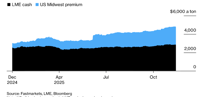Премии на металл в США взлетели выше 70% от биржевой цены, создав беспрецедентный дефицит и поставив потребителей на грань выживания Цены на алюминий в США расходятся с мировыми. Источник: Bloomberg Пока мировые рынки металлов снижаются на ожиданиях по ставке ФРС, внутри США разворачивается собственная драма, фактически сломавшая рынок алюминия. Очередным катализатором стал сырьевой гигант Rio Tinto, который ввел новые надбавки на свои поставки, усугубив кризис, спровоцированный импортными пошлинами. Ситуация дошла до того, что промышленные потребители в США вынуждены платить за алюминий премию, превышающую 70% от его базовой биржевой цены на Лондонской бирже металлов (LME). На прошлой неделе итоговая стоимость алюминия с поставкой в США обновила исторический максимум. Проблема имеет глубокие корни. США критически зависят от импорта алюминия, причем более половины поставок исторически обеспечивала Канада. Однако 50%-ная пошлина, введенная администрацией Дональда Трампа, сделала канадск