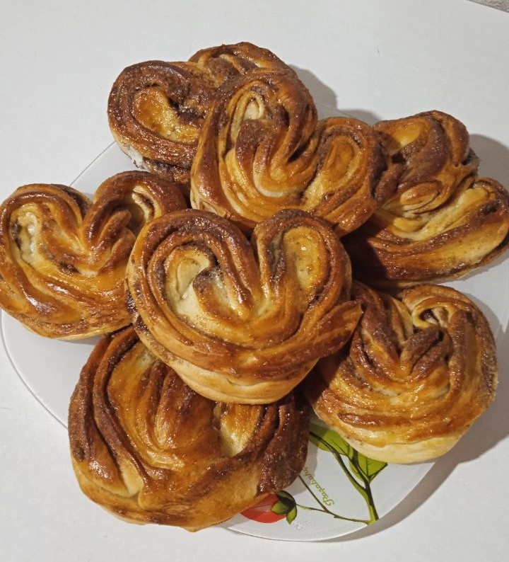 Самые вкусные булочки, которые я когда-либо пробовала. Делаются очень просто, а их вкус вызывает восторг. 1. Готовое тесто делим на равные части примерно по 80-90 и формируем из них ровные колобки. Затем накрываем их пищевой пленкой или полиэтиленовым мешочком для предотвращения пересушивания теста. 2. Пока заготовки для булочек расстаиваются, приготовим начинку: в небольшую миску высыпаем корицу и сахар, хорошо перемешиваем; в другую миску наливаем масло. 3. Каждый шарик раскатываем в тонкую лепешку и смазываем ее растительным маслом для того, чтобы слои булочки не слипались друг с другом. 4. Посыпаем на масло корицу с сахаром примерно 1 чайную ложку и скручиваем в рулет. Край защипываем.З 5. Затем складываем рулет пополам и разрезаем вдоль посередине со стороны сгиба, отступая от другого конца примерно 1 см. 6. Выворачиваем срезом наверх и формируем булочку. 7. Таким же способом делаем остальные плюшки, выкладываем на противень, застеленный пергаментом, накрываем пленкой и оставля