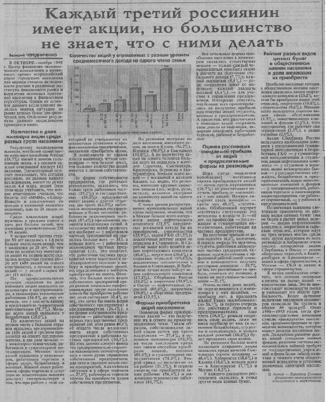 Архив финансовой прессы: о чем писали газеты 90-х и 2000-х В «Яндексе» есть поиск по архивам — можно искать архивные документы и газетные выпуски начиная с середины 18 века. ➖«Фондовый рынок России вошел в тройку наиболее прибыльных в мире» в 1997 году ; ➖Каждый третий россиянин имеет акции, но большинство не знает, что с ними делать» в 1995 году ➖РТС по 66,77 в 1998 году; ➖Реклама «МММ» в газетах 1993-1994 года • «Рост в 325%» • «Самое выгодное вложение ваших денег» • «Лучшая защита от нищеты и инфляции» • «Постоянный рост стоимости акций» • «самые высокие дивиденды в России» В июле 1994 года пирамида «МММ» рухнула. Компания прекратила выплаты, ее глава Сергей Мавроди был арестован, а миллионы вкладчиков потеряли свои сбережения. Яркие лозунги — печальный конец… ➖Прогнозы из прошлого ▪️«Известия», ноябрь 2002 г.: «Человек, вложивший два года назад $100 в компанию «ЮКОС», сейчас увеличил бы эти деньги в 11 раз» ▪️«Известия», май. 2008 г.: «Однако потенциал газового концерна, о