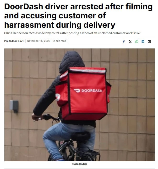 В США курьерша попыталась выдать себя за «жертву сексуального насилия» И в итоге именно на неё завели уголовное дело, забанили TikTok и выгнали с работы. История такая: девушка привезла заказ, в примечании было написано «оставить у двери и идти на все четыре». Но вместо этого она решила подсмотреть внутрь квартиры — и увидела спящего мужика со спущенными штанами. Она тут же сняла это на видео, выложила в TikTok и заявила, что стала жертвой домогательства: мол, клиент заранее знал, что курьер будет женского пола, и специально лёг так «в неприличном виде». Полиция заявление отклонила. Офицер прямо сказал: мужик был у себя дома, никого к себе не звал и ничего незаконного не делал. В итоге курьершу арестовали за клевету и разглашение частной жизни, а сервис доставки заблокировал её аккаунт. Мы реально живём в обществе дебилов 🚬... Подробнее: https://hard-tm.su/threads/128234/ 🕹HARD-TM — Подписаться