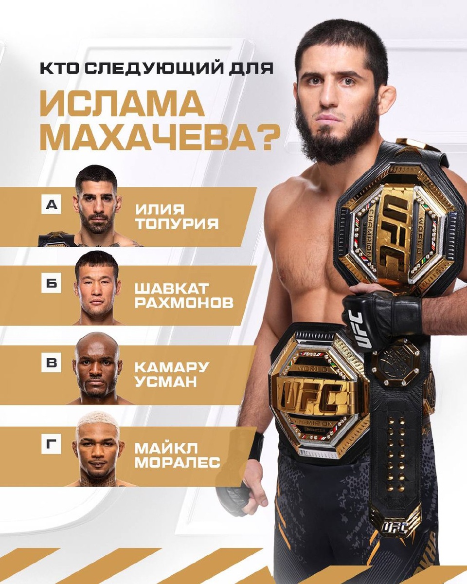 Кто должен стать следующим соперником Ислама? ❤️ Топурия 👍 Шавкат ⚡️ Усман 🔥 Моралес