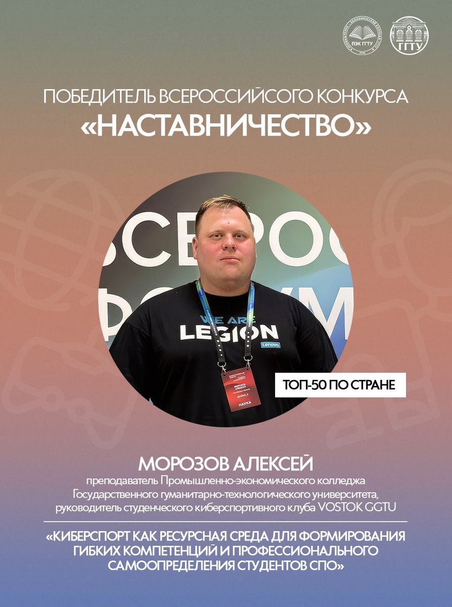 Преподаватель Промышленно-экономического колледжа Государственного гуманитарно-технологического университета (руководитель студенческого киберспортивного клуба VOSTOK GGTU) Алексей Морозов стал одним из победителей Всероссийского конкурса «Наставничество» 2025. Его конкурсная работа вошла в ТОП-50 лучших наставнических практик 🔥 На оценку жюри был представлен проект «Киберспорт как ресурсная среда для формирования гибких компетенций и профессионального самоопределения студентов СПО» в номинации «Наставничество в сфере образования, воспитания и молодёжной политики». Конкурсные работы оценивались по трём ключевым критериям: уникальность и инновационность, результативность и практическая значимость, а также потенциал масштабирования для применения в других организациях и регионах. В конкурсе приняли участие свыше 10 тысяч человек из 89 субъектов. По итогам технического отбора к оценке жюри было допущено около 4 тысяч работ. 📍 Торжественная церемония награждения победителей состоится
