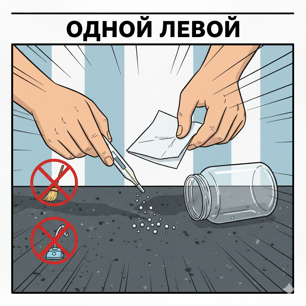 Вы случайно разбили ртутный градусник. Мелкие шарики ртути (Hg) раскатились по полу, и вы понимаете, что собирать их пылесосом или тряпкой опасно. Возникает паника, и кажется, что требуется сложная демеркуризация.