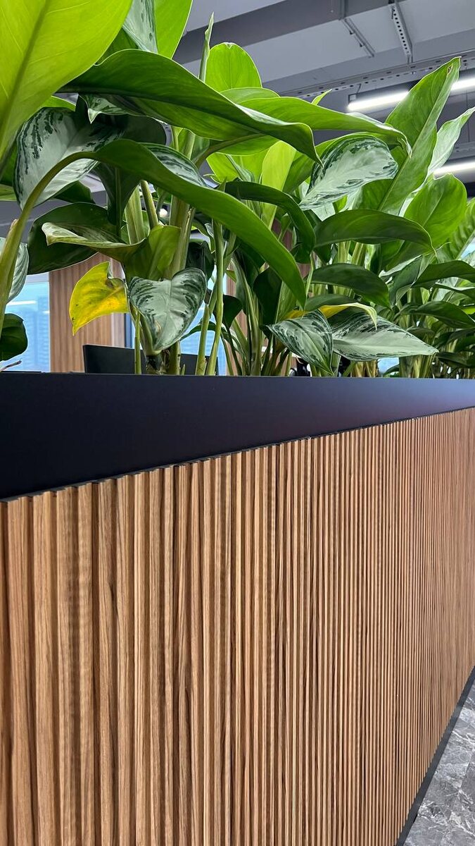 Пространство для лидера, созданное из природы и инноваций Офис компании «Монарх»: www.monarch-club.ru — крупнейшая дистрибутивная сеть в бизнесе напольных покрытий России с филиалами от Калининграда до Владивостока. Проект реализовали штатные дизайнеры компании «Монарх». Реализованные решения: Единый стиль и статус. В отделке ключевых зон — кабинетов и несущих колонн — использованы модульные панели c аккустическим эффектом ACUPAN модели «Трапеция» (122501.92) цвета «Светлый Орех» (Licht Nussbaum). Это решение добавило интерьеру тепла, солидности и акустического комфорта. Эффектное зонирование и оживление пространства. Центральным декоративным элементом стало мега-кашпо с натуральными растениями. Этот прием позволил мягко и эстетично разделить открытое пространство, наполнив его жизнью и природной свежестью. Получился яркий акцент, который запоминается каждому гостю. Модульные панели ACUPAN — это легкий монтаж и потрясающий вид! Вдохновляйтесь и творите!
