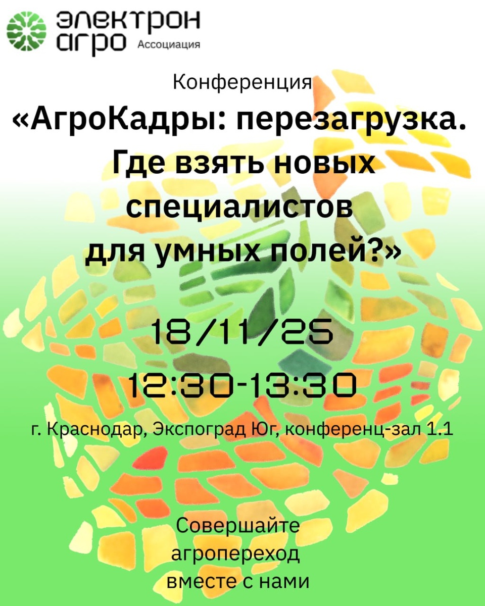🔈ВСЁ НАЧИНАЕТСЯ СЕГОДНЯ! Друзья, этот день настал! 🗓 Сегодня, 18 ноября, в Краснодаре стартует масштабная выставка ЮгАгро, и мы ждём вас на двух площадках: 1️⃣ Конференция «АгроКадры: перезагрузка. Где взять новых специалистов для умных полей?» Как мы и обещали, ровно в 12:30 в зале 1.1 мы начинаем важный разговор о том, где взять новых специалистов для умных полей. Ждём всех, кому важно: ✅ Преодолеть кадровый голод в АПК. ✅ Узнать об уникальной образовательной программе от «ЭлектронАгро». ✅ Понять, как готовить кадры, говорящие на одном языке с технологиями. 2️⃣ Наш стенд C6003 (Павильон 3) После конференции (а для кого-то и прямо с утра!) мы ждём вас в гости на нашем стенде! ✨ Покажем работающие решения в действии. ✨ Ответим на ваши вопросы. ✨ Найдём пути развития именно для вашего хозяйства. Встречаемся в «Экспоград Юг»!