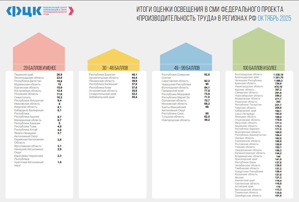 Согласно рейтингу Федерального центра компетенций, ОРЕНБУРГСКАЯ ОБЛАСТЬ в очередной раз, подтвердила свои лидерские позиции в медиаосвещении реализации Федерального проекта "Производительность труда" (входящего в нацпроект "Эффективная и конкурентная экономика") за октябрь 2025 года. Данный рейтинг формируется по данным ФЦК и входит в годовой рейтинг Минэкономразвития РФ по регионам.