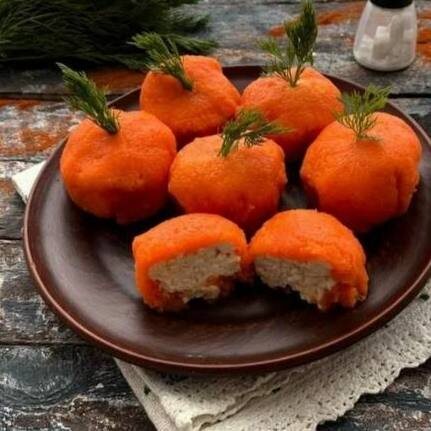 Эти "Мандаринки" получаются очень нежными, сочными и по-настоящему праздничными. Рецепт действительно простой. Закуска получается красивой и вкусной. Этот рецепт имитирует форму и цвет мандаринки, а морковь не только дает цвет, но и выступает в роли натурального "клея". · Куриное филе (грудка) — 1 шт. (около 250-300 г) · Морковь — 2-3 средние шт. (для обваливания) · Сыр твердый (например, Российский) — 100 г · Чеснок — 1-2 зубчика (по желанию, для пикантности) · Майонез (или густой йогурт) — 2-3 ст. ложки · Соль — по вкусу · Перец черный молотый — по вкусу · Зелень для веточек — укроп, петрушка или перья зеленого лука 1. Подготовка курицы. Куриное филе отварите в слегка подсоленной воде до готовности (около 20-25 минут после закипания). Остудите и измельчите. Идеальный способ — нарезать очень мелким кубиком или провернуть через мясорубку с крупной решеткой. Так начинка будет сочнее, чем если использовать блендер. 2. Подготовка моркови. Морковь тщательно вымойте и отварите в кожуре