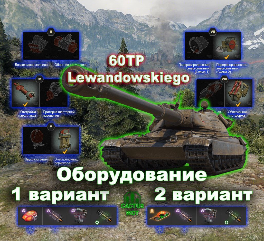 🇵🇱 60TP Lewandowskiego 🉑Тяжелый танк прорыва 10 уровень. ⛏Оборудование и полевая модернизация на картинке🔼 ➕Плюсы танка 📈хорошая броня башни; 📈орудие с большим разовым уроном; 📈большой запас прочности. ➖Минусы танка 📉слабая динамика танка; 📉плохо бронированный корпус танка; 📉большие уязвимые зоны в лобовой проекции. ⬇️⬇️⬇️⬇️⬇️⬇️⬇️⬇️ #базазнаний@CactusWOT #60TP@CactusWOT #миртанков