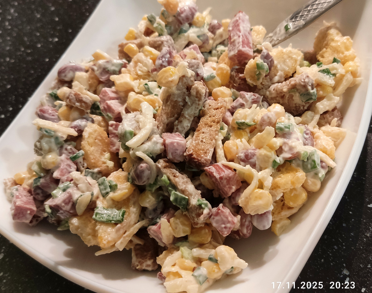 Один из любимых салатов! Отлично подойдёт для застолья, особенно новогоднего. Именно потому что он очень сытный. Узнала я о нём, когда жила в общежитии и конечно тогда мы его делали без колбасы и сыра. Только очень редко и как говорится по большим праздникам. Но студенты народ привычный, мы тогда и на лепёшках из воды и муки могли неделю прожить 😄 Собственно говоря, поэтому и называла его раньше студенческим. А уже позже прижилось название «сытный», потому что именно так его и называли, когда просили приготовить. Состав у него такой: Приготовление: Колбасу нужно порезать примерно как картошка фри - брусочками. Обжарить на сильном огне, на сухой сковороде, постоянно помешивая. Нужно просто слегка вытопить жир. Обжаренную колбасу выложить на тарелку с бумажным полотенцем и поставить остывать. В сито выложить фасоль из банки и слегка промыть питьевой водой. В это же сито выложить кукурузу. Оставить стекать. Сыр потереть на крупной тёрке сразу в миску , где будете замешивать салат. Туда