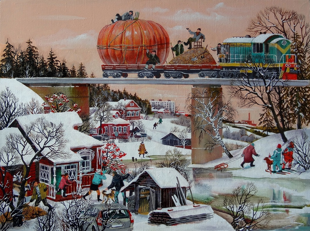 Текст и фото: "ПАНТОГРАФ" Друзья, уже совсем скоро Новогодние праздники. Делимся с Вами сказочным предпраздничным настроением с замечательными работами Дины Ельцевой ))) Как видим художник создает свою реальность, красочную, не без юмора. Но почему-то вот эти картины с элементами нереального привлекают внимание. Мир фантазийный, хотя с элементами реального, яркий и привлекающий внимание. Биография Дины весьма скупа. В 1989 году она окончила московский государственный институт им. В.И. Сурикова, с 1991 года член Союза Художников России. Проживает в городе Королев. "Тыкву везут" 1. ВДНХ. 2. Большая рыба весной. 3. Сказки. 4. Вид с капусты. 5. Морковь. 6. Человек и гриб. 7. Капуста. 8. Большие яблоки. 9. Большие грибы. 10. Куры и гуси. 11. Огурцы. 12. Денежное дерево. 13. Глобальное потепление. Свадьба. 14. Бабочки и телега. 15. Большая рыба в деревне. 16. Луна. 17. Тепловоз. 18. Снеговик. 19. Название не указано. 20. Зимняя рыбалка. 21. Нашли гриб. 22. Яблоко. 23. Рак на горе. 24. Огн