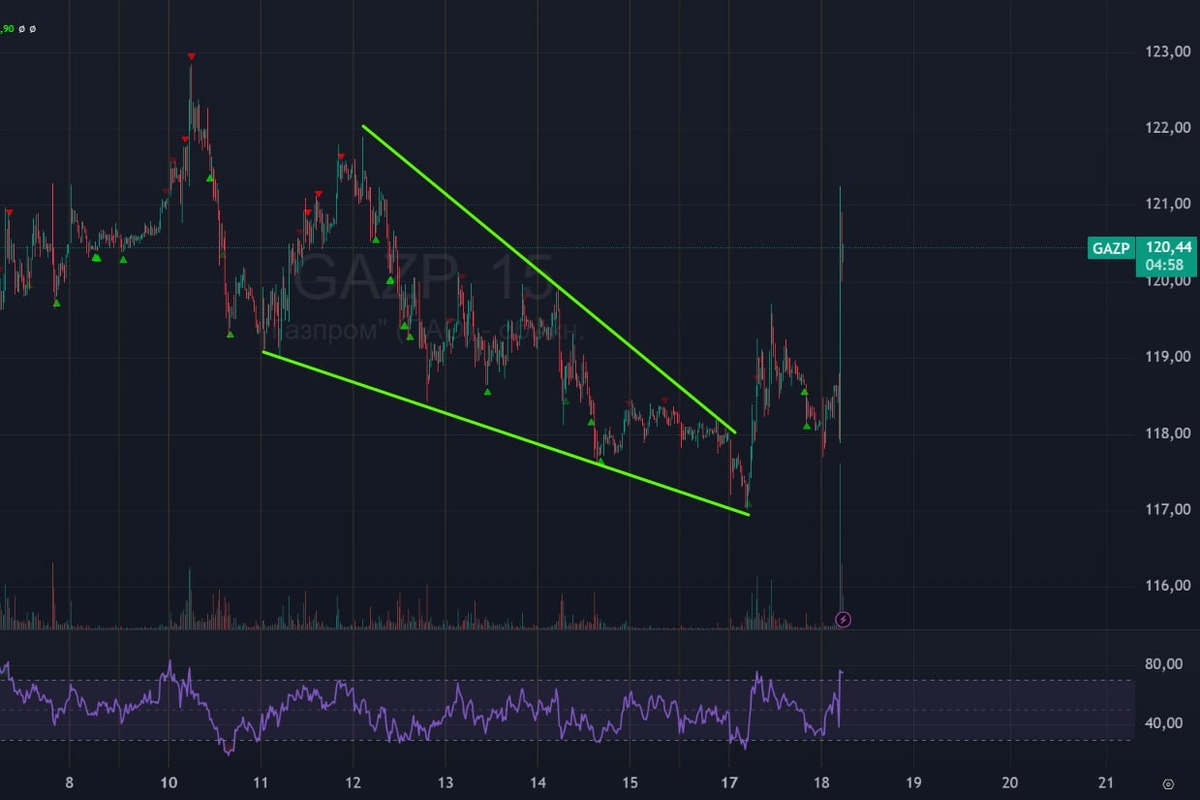 🟢 Газпром отработал свою цель по клину на 120 руб. Дальше мы во власти новостных событий. Но ожидания у меня прежние - жду резинку. Газпром уже очень долго в накоплении.
