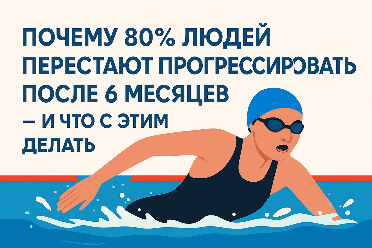 Почему 80% людей перестают прогрессировать после 6 месяцев — и что с этим делать Если вы заметили, что последние недели — а может, месяцы — плаваете «как вчера», значит вы попали в ту самую статистику. Около 80% людей перестают прогрессировать спустя 4–6 месяцев занятий, даже если продолжают ходить в бассейн стабильно. Почему так происходит? Ответ прост: вы упёрлись в потолок… которого нет. Это искусственный потолок, созданный привычками, психологией и неправильным подходом к тренировкам. Разбираем по полочкам — и главное, объясняем, как выбраться. 1. Вы плывёте “на автомате”, а не учитесь Сначала всё новое: вода, дыхание, движения. Организм развивается на каждом занятии. Но через несколько месяцев мозг включает режим «я понял, как это работает» — и перестаёт адаптироваться. И вы начинаете плавать одно и то же расстояние, в одном темпе, одинаковыми движениями. Это не тренировка. Это — плавание ради плавания. ✔ Что делать: • Меняйте задачи каждые 1–2 тренировки. • Добавляйте