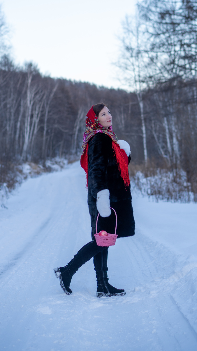 В начале ноября зима полностью взяла верх в наших краях. Снег покрыл землю плотным белым одеялом, побелил лесные тропы и укрыл тайгу. Только могучий Амур продолжал сопротивляться холодному дыханию зимы, не давая холоду сковать себя сплошным ледяным панцирем. В один из выходных дней я предложил хорошей своей знакомой Нине выехать за город и провести фотосессию на природе. Первую зимнюю. Не только в этом сезоне, но и вообще, так как практики зимней съемки у меня еще не было. Нина с удовольствием согласилась, и мы во второй половине дня, так, чтобы прихватить «золотой час», выехали за город, на одну из лесных дорог, по которой зимой только рыбаки и ездят на побережье Охотского моря, где ловят навагу со льда. Чтобы никому не мешать, мы припарковались на придорожной полянке. Погода выдалась пасмурная, что было даже вообщем-то и неплохо – свет был мягким, самым подходящим для хорошего снимка. Нина решила использовать образ «русская красавица зимой» - шуба, цветастый платок, белые пуховые в