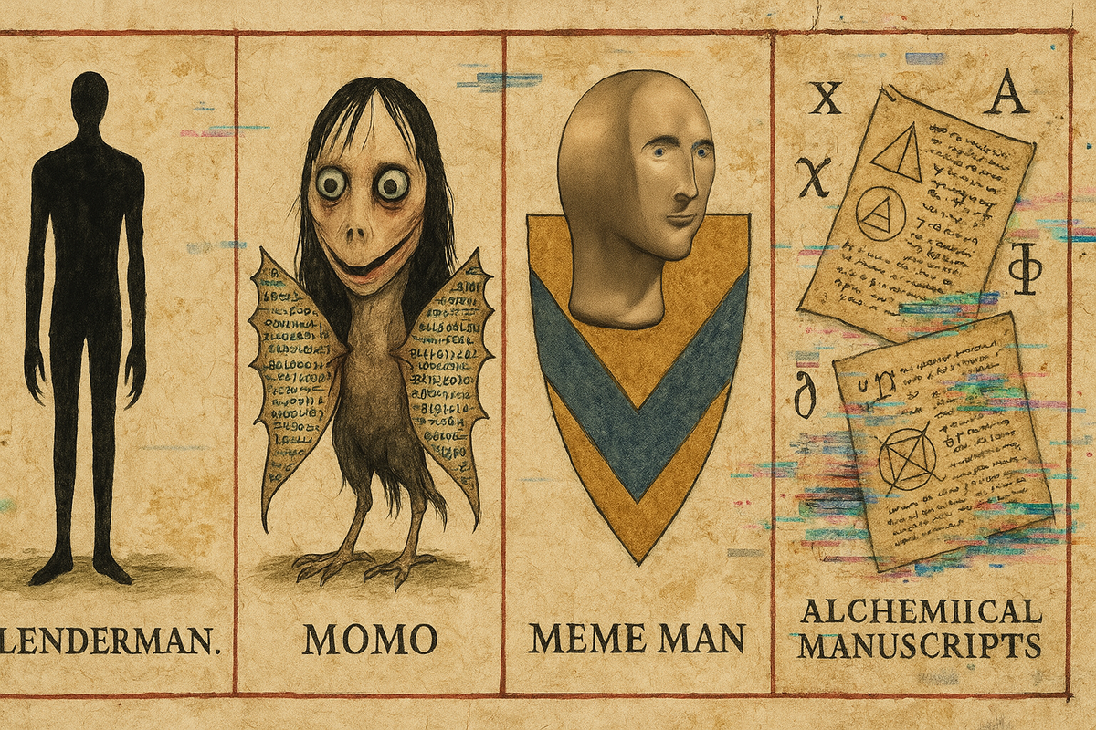 От Слендермена до Человека-мема: антропология цифрового фольклора 🧿 ПРОЛОГ: РОЖДЕНИЕ БОГОВ ИЗ ПИКСЕЛЕЙ 2009 год. На форуме Something Awful пользователь с ником «Victor Surge» загружает отретушированную фотографию: неестественно высокий человек в костюме без лица. За 24 часа Слендермен из шутки превращается в современного мифологического персонажа с тысячами свидетельств «очевидцев». Цифры новой мифологии: · 73% подростков 13-17 лет знают хотя бы одного интернет-монстра · Каждые 72 часа рождается новый вирусный персонаж · 400+ фильмов и игр основаны на creepypasta · 0.04 секунды — среднее время создания нового мем-персонажа 📜 ГЛАВА 1: ТАКСОНОМИЯ ЦИФРОВЫХ ХИМЕР Класс 1: Архетипы-мутанты · Слендермен — переосмысление «лесного духа» · Момо — цифровая версия бабайки · Джефф-убийца — современный вариант маньяка-легенды Класс 2: Вирусные призраки · Smile Dog — первая фотография, ставшая мемом-проклятием · Кикер — аниме-персонаж как носитель паники · Backrooms — архитектурный ужас