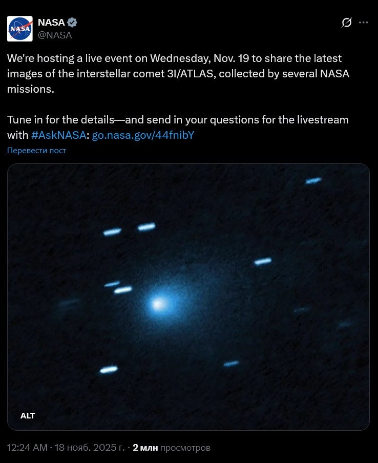 НАСА В прямом эфире покажет 3IATLAS 19 ноября! Никогда не видел, чтобы НАСА делало что-то подобное для обычной «Кометы», если таковая имеется. Сообщение от НАСА: В среду, 19 ноября, мы проведём прямую трансляцию, на которой поделимся последними снимками межзвёздной кометы 3I/ATLAS, полученными в ходе нескольких миссий НАСА. Подключайтесь к нам, чтобы узнать подробности, и присылайте свои вопросы для прямой трансляции с помощью. Трансляция начнётся в 23:00 по московскому времени (MSK). Ссылка в телеграм. ✅ ПОЛНЫЕ версии видео тут! ✅ Обсудить новость в ЧАТЕ