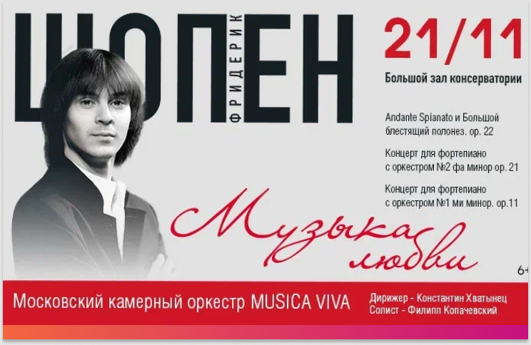 21 ноября Большой зал Московской консерватории наполнится музыкой, которая стала синонимом любви, тоски и невысказанных чувств. «Музыка любви» — так назван вечер, целиком посвященный гению Фридерика Шопена. Погружение в эпоху романтизма будет полным: под сводами исторического зала прозвучат два его бессмертных концерта для фортепиано с оркестром — произведения, в которых блестящая виртуозность сливается с пронзительной лирикой. Это музыка, в которой можно утонуть, музыка, которая говорит с сердцем напрямую, без слов. Исполнять ее будут мастера высочайшего класса: лауреат международных конкурсов Филипп Копачевский, чье исполнение Шопена уже покорило, в том числе, и строгую японскую публику. За дирижерский пульт встанет один из самых востребованных дирижеров России — Константин Хватынец. А аккомпанировать им будет знаменитый Московский камерный оркестр Musica Viva под руководством Александра Рудина, известный своим безупречным вкусом и бережным отношением к музыке. Это не просто концерт