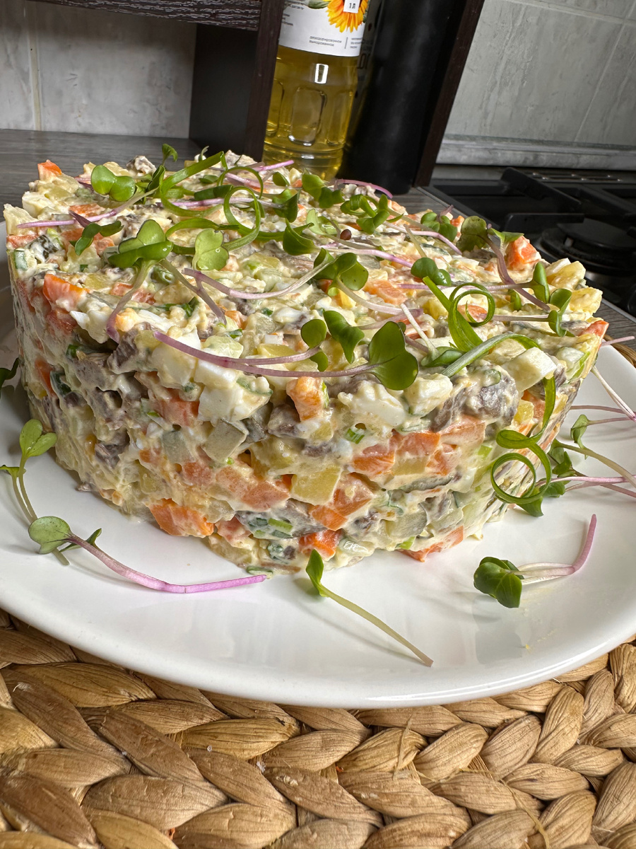 САЛАТ СТОЛИЧНЫЙ . САЛАТ СТОЛИЧНЫЙ . Все овощи на салат я запекаю в фольге 1 час 200 градусов . Говядину отварила в подсоленной воде до готовности . Ингредиенты: Говядина отварная Яйца Огурец свежий Огурец соленый (маринованный ) Картошка Морковь Зеленый Лук Майонез Соль Украсила микрозелкнью и зеленым луком . #рецепты#салатстоличный