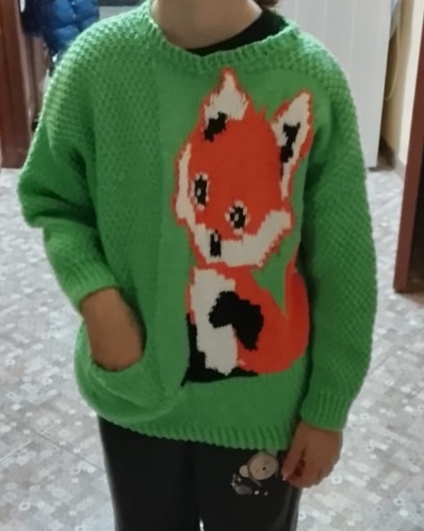Здравствуйте. Строго не судите, это первый мой джемпер, с вывязанной картинкой. Для вязания использовала пехорскую "Детскую новинку". Это чистый акрил, до вто при вязании немного поскрипывал. После стирки джемперок стал очень мягкий. Выбор пряжи был по двум критериям - практичность и неколкость. А еще мне очень нравятся яркие цвета этой пряжи. На второй картинке четко передается цвет ниток. И можно посчитать количество петель и даже количество рядов. Это сшивное изделие, вязалось снизу вверх. Спинка отдельно, а перед отдельно. Горловинку сделала широковатой, но это так нужно, чтобы косички влезали без проблем) Закрывала горловину эластичным закрытием. Основной узор - крупный рис. Рисунок вязала на фоне лицевой глади. Вначале набирала 88 петель, вязала резинку вытянутой петлей, затем прибавляла каждую шестую петлю. Высоту считайте по своему ребенку. Вывязала такой маленький кармашек, внутри он оранжевый. Симпатично получился) Схему лисенка нашла на пинтересте: Рисунок вывязывала