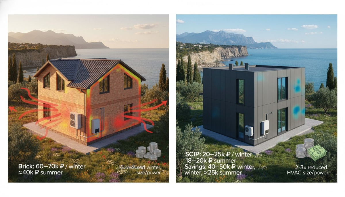 Сколько реально сэкономить в Крыму на отоплении и кондиционировании? Отвечаем цифрами 🔥 SCIP‑панели дают запас по сопротивлению теплопередаче в 2–3 раза выше обычного — значит мощность котла и кондиционера можно сократить в 2–3 раза. На практике: дом 100 м² на ЮБК — кирпич: 60–70 тыс. ₽ за зиму; дом из SCIP: ≈20–25 тыс. ₽. Экономия за зиму 40–50 тыс. ₽. Летом — примерно 40 тыс. ₽ против ≈18–20 тыс. ₽ у SCIP, ещё ≈25 тыс. ₽ в кармане 🏠💸 Хотите расчёт под ваш проект? Напишите нам — мы посчитаем. Наш главный канал BOX HOUSE