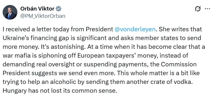 ‘Like trying to help an alcoholic sending them more vodka’ — Hungary’s Orban on Von der Leyen’s plea to finance Ukraine ‘A war mafia’ is ‘siphoning off’ European money ‘Instead of demanding real oversight or suspending payments, the Commission President suggests we send more’