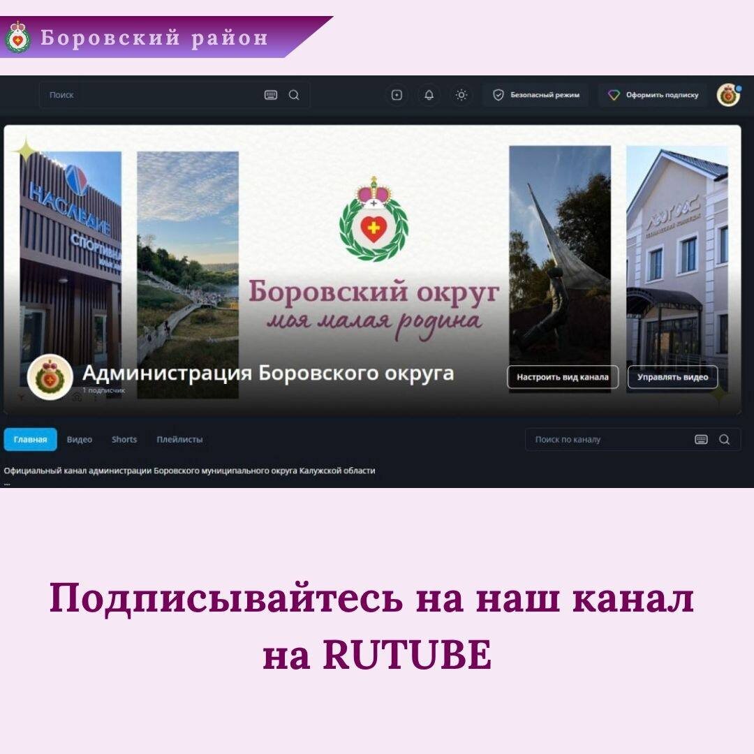 Мы на RUTUBE 📹 Продолжаем расширять своё присутствие в цифровом пространстве и запустили официальный канал на популярной российской видеоплатформе RUTUBE. На канале вы найдете: 🎞 сюжеты о жизни Боровского округа, 🎞 интервью с представителями администрации и интересными жителями, 🎞 видеоотчеты о реализации важных проектов и ремонтных работ. 👤Подписывайтесь на наш канал по ссылке: https://rutube.ru/channel/45654652/ Будьте в курсе самых актуальных событий Боровского округа! #Тема_дня_RUTUBE