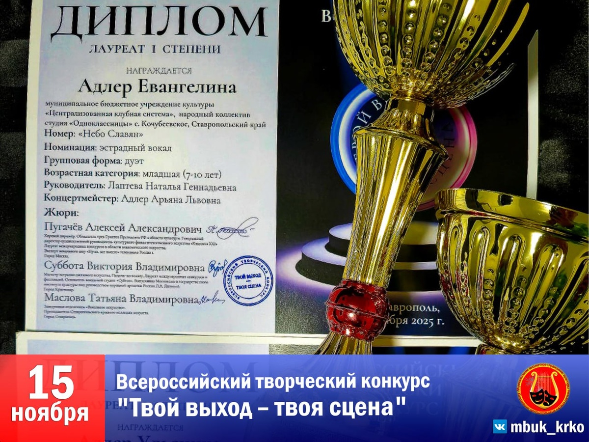 💥🏆 НОВАЯ ПОБЕДА «ОДНОКЛАССНИЦ» 🏆💥💥 📣 В Ставропольском Дворце детского творчества состоялся Всероссийский творческий конкурс "Твой выход – твоя сцена". Это событие стало настоящим праздником искусства и платформой для демонстрации талантов молодежи со всей страны. ⚡️Конкурсы такого уровня играют ключевую роль в раскрытии юных дарований, предоставляя им бесценный опыт и мощный стимул для дальнейшего развития. 🥇 Среди многочисленных участников наши юные вокалистки, участницы народного коллектива студии эстрадно-джазового вокала «Одноклассницы» – Ульяника и Евангелина Адлер, показали высочайший уровень подготовки и мастерства, став лауреатами I степени. 🎙 Их выступления отличались артистизмом, силой голоса и глубоким проникновением в исполняемые произведения. ⭐️ Поздравляем Ульяну, Евангелину и их талантливого руководителя Наталью Геннадиевну Лаптеву с этой заслуженной победой! Желаем им не останавливаться на достигнутом, продолжать развиваться и радовать нас своим творчеством