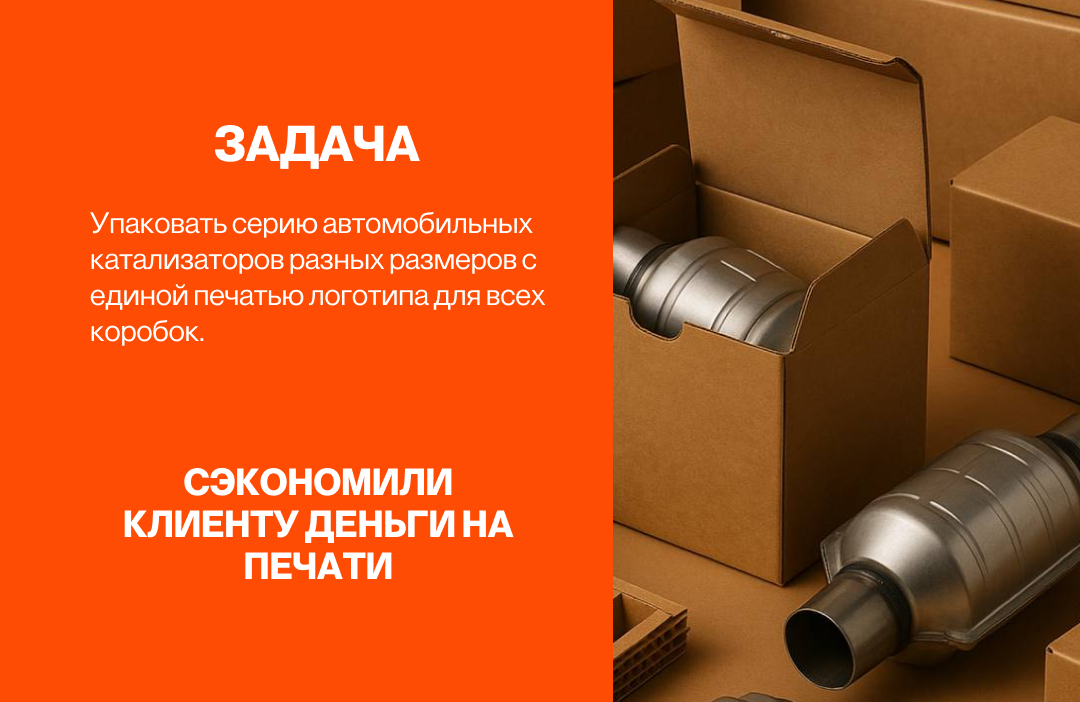 Кажется, что коробка — это просто упаковка, и можно выбрать любую, подходящую по размеру. Но как только дело доходит до реального товара, особенно хрупкого, тяжёлого или нестандартного, всё меняется. Недавно к нам обратился клиент, которому нужно было упаковать серию автомобильных катализаторов. Размеры у всех разные, детали тяжёлые, конструкция нужна надёжная, а печать — одна на все коробки. Классическая задачка «как упростить сложное». И вот что мы сделали. Клиент пришёл с простым запросом: коробки из бурого картона, чёрная печать, конструкция «ласточкин хвост». Но важный нюанс — коробки нужны шести разных размеров. Штанцформа — это как лекало в швейном деле. Благодаря ей коробка получается идеальной формы и размера под конкретный товар. Для разных катализаторов мы изготовили шесть отдельных форм. Каждая коробка рассчитана под конкретный размер и вес детали. Ничего не движется внутри, а вес детали не продавливает дно. Это то, что невозможно получить при подборе стандартных коробок «н