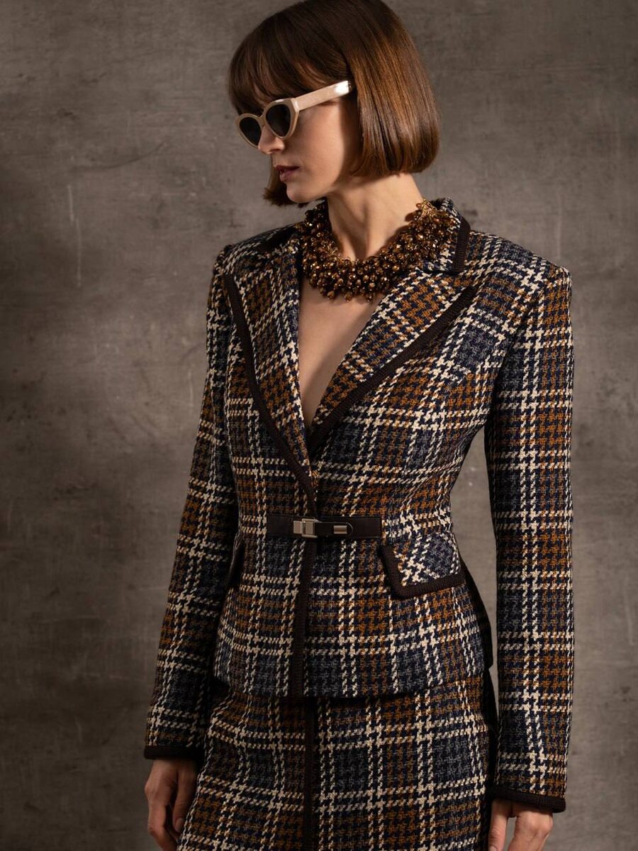 Комфортная мягкая ткань в стилизованную клетку в оттенках сезона, акцентная застежка жакета и юбка миди с боковым разрезом — найден