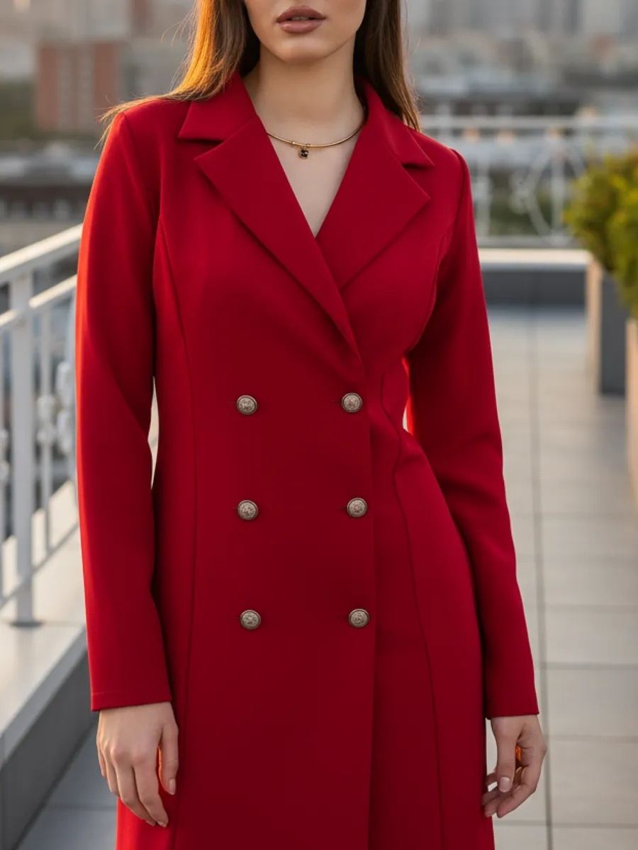 Это платье-пиджак – идеальное решение для тех, кто ценит элегантность и многофункциональность. Двубортный крой и прямые длинные рукава создают строгий, но женственный силуэт, который одинаково уместен как в офисе в дневное время, так и на вечернем торжестве. Полуприлегающий фасон мягко обрисовывает фигуру, не сковывая движений, что особенно важно для продолжительных праздничных мероприятий. Состав ткани с добавлением эластана обеспечивает идеальную посадку по фигуре.