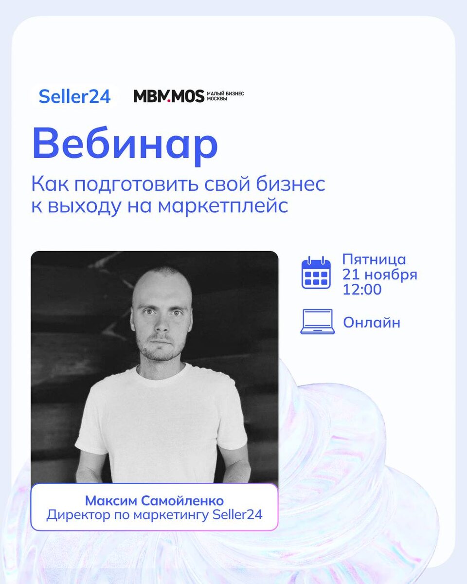 Как избежать типичных ошибок при выходе на Ozon или Wildberries и использовать маркетплейсы осознанно – обсудим на вебинаре от ГБУ «Малый бизнес Москвы» МБМ и Seller24. Директор по маркетингу Seller24 Максим Самойленко расскажет, что делать с логистикой и остатками, как готовиться к конкуренции, комиссиям и ставкам и как посчитать юнит-экономику. 📅 Дата: пятница, 21 ноября ⏰ Время: 12:00 мск 📍Участие бесплатное, нужна предварительная регистрация по ссылке