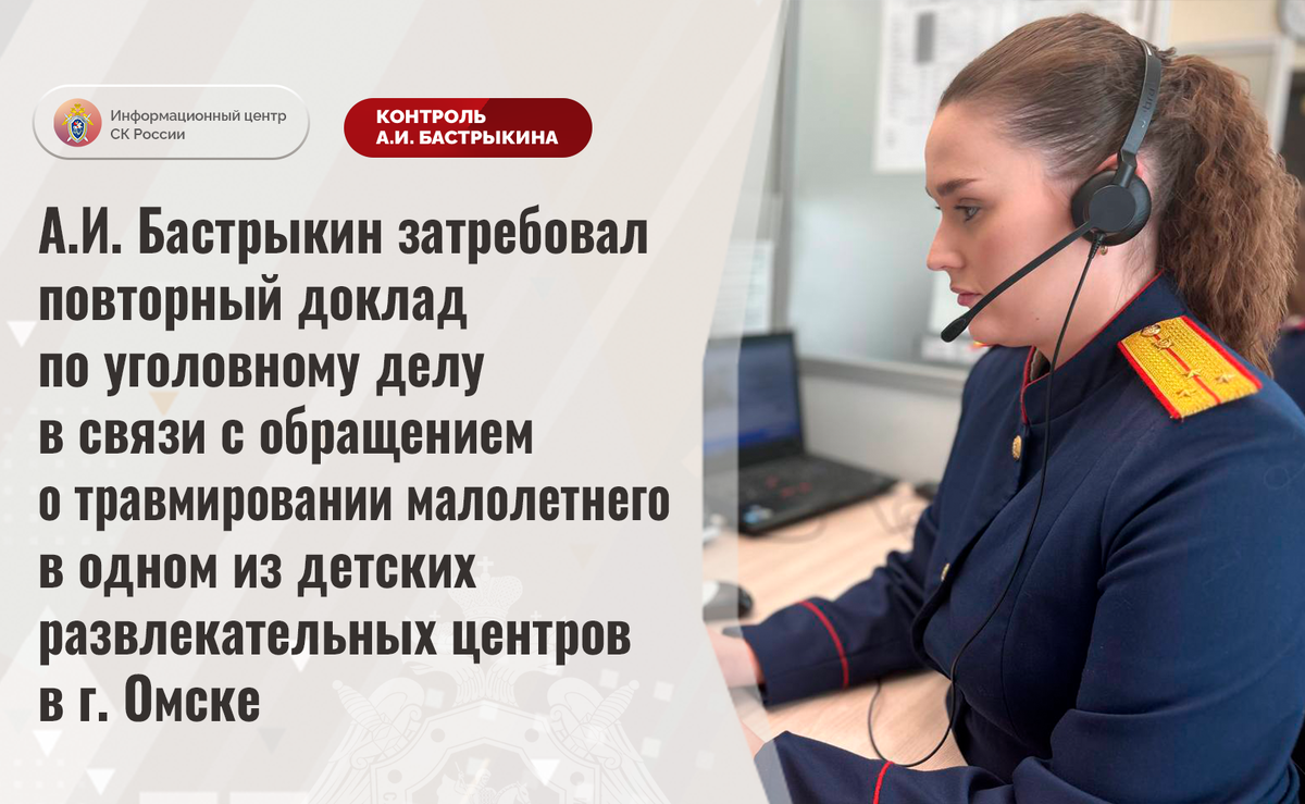 А.И. Бастрыкин затребовал повторный доклад по уголовному делу в связи с обращением о травмировании малолетнего в одном из детских развлекательных центров в г. Омске На единую многоканальную телефонную линию Информационного центра СК России обратилась жительница города Омска по вопросу несогласия с ходом установления обстоятельств травмирования ее трехлетнего сына на территории игрового комплекса. В декабре прошлого года в связи с отсутствием креплений между элементами аттракциона ребенок упал с высоты. Пострадавшему потребовалась медицинская помощь. Отмечается, что расследование уголовного дела приняло затяжной характер, до настоящего времени никто к ответственности не привлечен. Ранее указанная ситуация освещалась в СМИ. В СУ СК России по Омской области по данному факту расследуется уголовное дело, по которому ранее А.И. Бастрыкин поручал представить доклад. Председатель Следственного комитета Российской Федерации Александр Иванович Бастрыкин затребовал у руководителя СУ СК России по