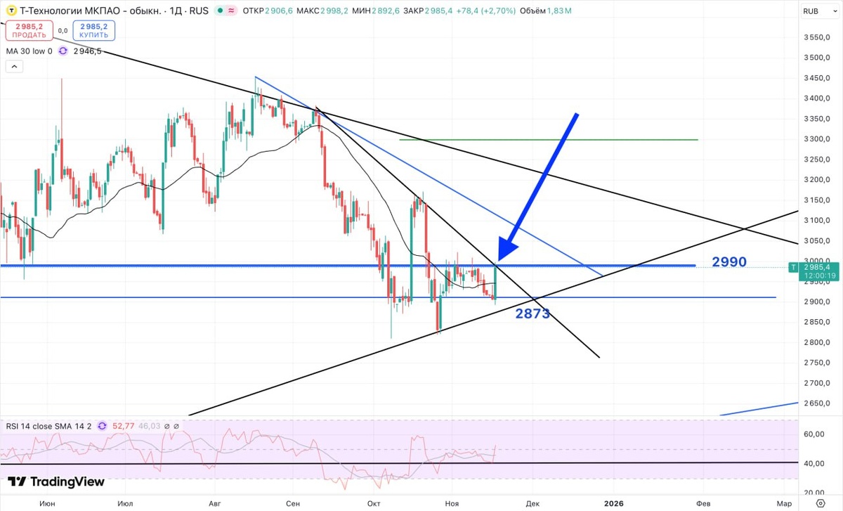 Т-Технологии пришли в ключевую точку пересечения горизонтального уровня и нисходящего тренда
