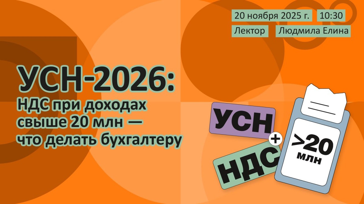 🔥 С 2026 года условия и правила применения НДС при УСН должны измениться. И это при том, что и к действующему порядку еще не все успели привыкнуть. В ближайший четверг, 20 ноября, наш журнал проведет вебинар «УСН‑2026: НДС при доходах свыше 20 млн — что делать бухгалтеру», на котором будут разобраны все насущные НДС-вопросы упрощенцев. В ходе вебинара ведущий эксперт журнала «Главная книга» Людмила Елина расскажет: ◾️кто из упрощенцев обязан платить НДС в 2026 г.; ◾️как правильно считать доходы для НДС‑лимита; ◾️на что обратить внимание в переходном периоде; ◾️как плательщику УСН выбрать ставку НДС в 2026 г. и где ее закрепить; ◾️о плюсах и минусах спецставок НДС 5% и 7%; ◾️о базовых правилах начисления НДС упрощенцами. Вебинар пройдет в прямом эфире в четверг, 20 ноября, с 10:30 до 13:30 по МСК. ▶️ Смотреть запись 🌐 Участвовать онлайн