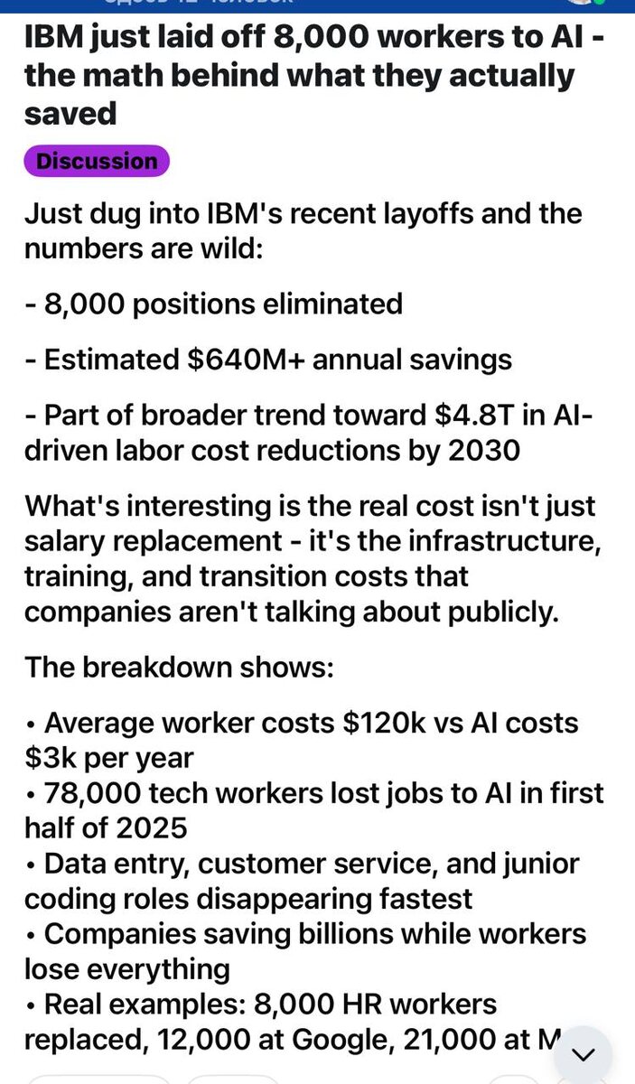 Что пишут …. 8000 человек уволили в пользу ИИ. Это старина IBM удивляет. Если что, мы никого не увольняем :) У нас вообще ротация мизерная, хотя задачи, признаюсь, не сложные - поддержка парсинга 1300 сайтов суточно. Русский ИТ бизнес