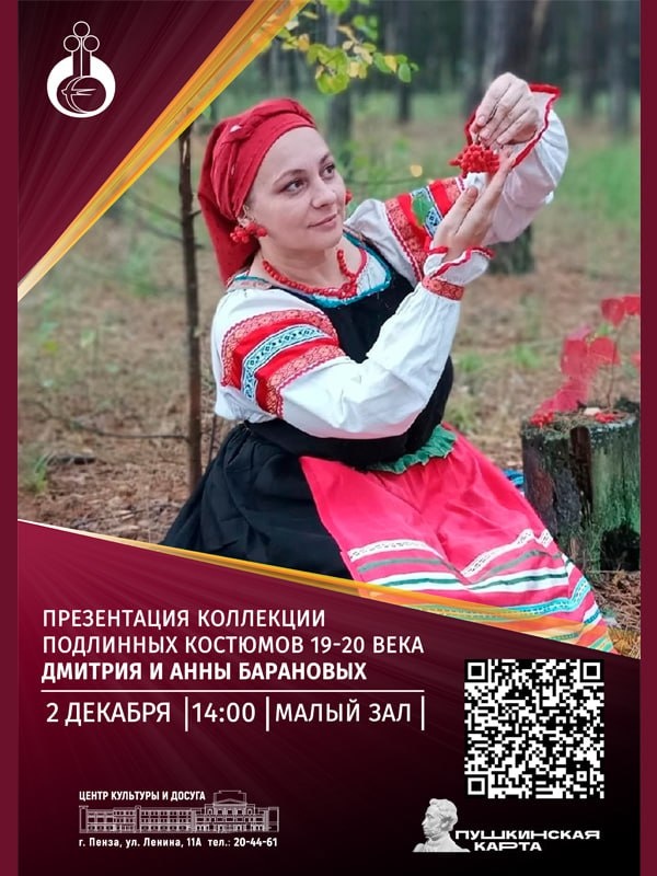 ✨ Презентация коллекции подлинных костюмов XIX-XX веков народов России Дмитрия и Анны Барановых 🇷🇺 В преддверии 2026 года, объявленного Президентом РФ В.В. Путиным Годом единства народов России приглашаем на выставку-презентацию подлинных костюмов XIX-XX веков народов России из личной коллекции семьи Барановых. 📌Будут представлены костюмы XIX-XX веков народов России: Пензенской, Воронежской, Брянской, Вологодской, Нижегородской областей, Чувашской, Марийской, Мордовской Республик и Республики Татарстан. ✅Возраст некоторых костюмов достигает более 130-ти лет: свадебные, повседневные, праздничные, зимние, а также украшения к ним. 🎤 В ходе мероприятия ведущая Валерия Андреева расскажет об истории этих костюмов, итересных фактах о них. и проведет со зрителями интерактив. 🎶Для собравшихся выступит этно-фолк группа "Вертоград". Она исполнит авторские и народные песни. 6+ ✅ Онлайн билеты: clc.li/UuLfd