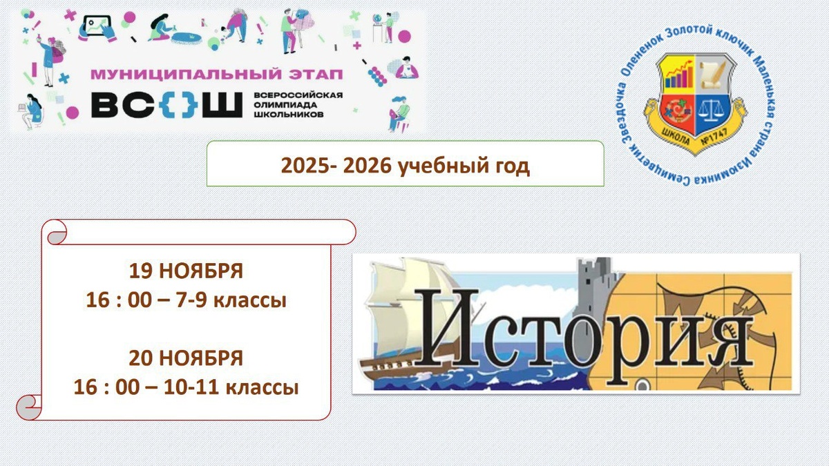 Дорогие ребята! 🤗 Опубликовано распределение участников на муниципальный этап всероссийской олимпиады школьников в Москве 2025/26 учебного года по истории. Соревнование для 7-9 классов пройдет 19 ноября 2025 года, для 10-11 классов – 20 ноября 2025 года. В оба дня тур начнется в 16:00. На выполнение заданий 7-8 классов будет отведено 150 минут, 9-11 классов – 235 минут. Школьникам необходимо взять с собой на тур: - документ, подтверждающий личность* (социальную карту, паспорт, справку из школы с фотографией или другой документ с фотографией); - листок участника или логин ВсОШ из него – должны выдать в вашей школе; - сменную обувь. Вся информация о муниципальном этапе собрана на странице. Желаем удачи! 💐 #ДОНМ #ШколыКолледжиМосквы #Школа1747