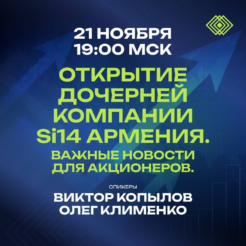 🎉Важное объявление для акционеров SI14 Ag! Приготовьтесь к новым горизонтам развития! Команда IWM с гордостью анонсирует открытие нашей новой дочерней компании «Si14 Армения»! 🗓️ Когда: 21 ноября, 19:00 МСК Это событие открывает двери для прямых покупок акций SI14 и перевода акционерной базы. Мы запускаем этот процесс уже в ближайшие дни, и хотим, чтобы вы были в числе первых, кто узнает все детали. На этой встрече основатель Si14 Ag Виктор Копылов и юрист компании Олег Клименко поделятся ключевой информацией, которая имеет значение для каждого акционера. Узнайте о преимуществах нового ЗАО, процессе перехода и планах на будущее. 🔗 Сохраните этот пост и запланируйте свое участие! https://us06web.zoom.us/j/2116731674?pwd=xahqmhZLmGsNMAcfVYG8sNdiNWlLRY.1
