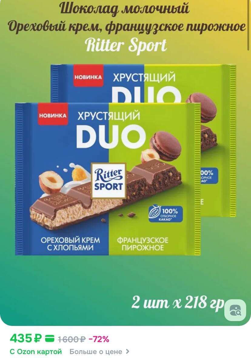 Шоколад RITTER SPORT молочный, ореховый крем с хлопьями и французское пирожное, 218 гр. 2 шт. https://ozon.ru/t/1GHC6ys ✅ Подписаться 🔣 Бот с промокодами