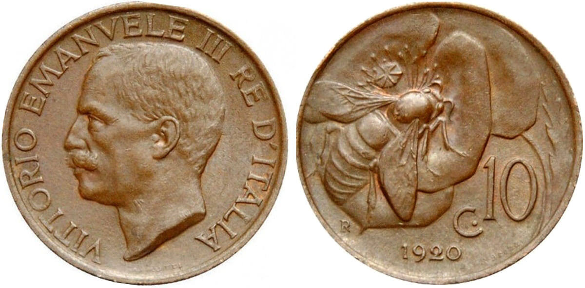 Чентезимо — это итальянская разменная монета, одна сотая лиры. Название произошло от латинского centesimus — сотая часть. Примерно в середине XX века чентезимо вышли из употребления и-за большой инфляции и разменные монеты Италии стали чеканить в лирах. Данная монета, выпускалась из меди в 1919 - 1937 гг.. Диаметр 22,5 мм. Тираж более 405 миллионов экземпляров за 19 лет производства. На аверсе Виктор Эммануил III (правил Италией дольше всех других монархов и провел на троне почти 46 лет) изображен без короны, его лицо повернуто влево, вдоль края полукругом идет надпись «Vittorio Emanvele III, re d'Italia» («Виктор Эммануил III, король Италии»). При этом, буква U написана как V, в древнеримском стиле. Снизу под портретом подпись гравера Королевского монетного двора Аттилио Сильвио Мотти (1867— 1935). На реверсе, довольно рельефном, изображена пчела на цветке, а его стебель и листок расположены правее. Между цветком и стеблем находится номинал (с. 10). Строчная буква с (расположена чуть