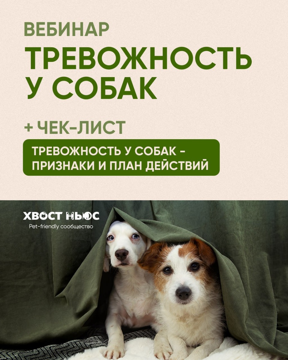 Вебинар «Тревожность у собак — что важно знать владельцу и как питание может помочь» + чек-лист в подарок 🎁 На вебинаре вы узнаете, что такое тревожность у собак и как она проявляется, почему она возникает и какую роль в этом может играть питание - об этом расскажет ветеринарный врач-терапевт и специалист поведенческой медицины Анжелика Клекот. Получите ценные рекомендации и чек-лист «Тревожность у собак - признаки и план действий» по ссылке 🐶 #ШколаХвостНьюс