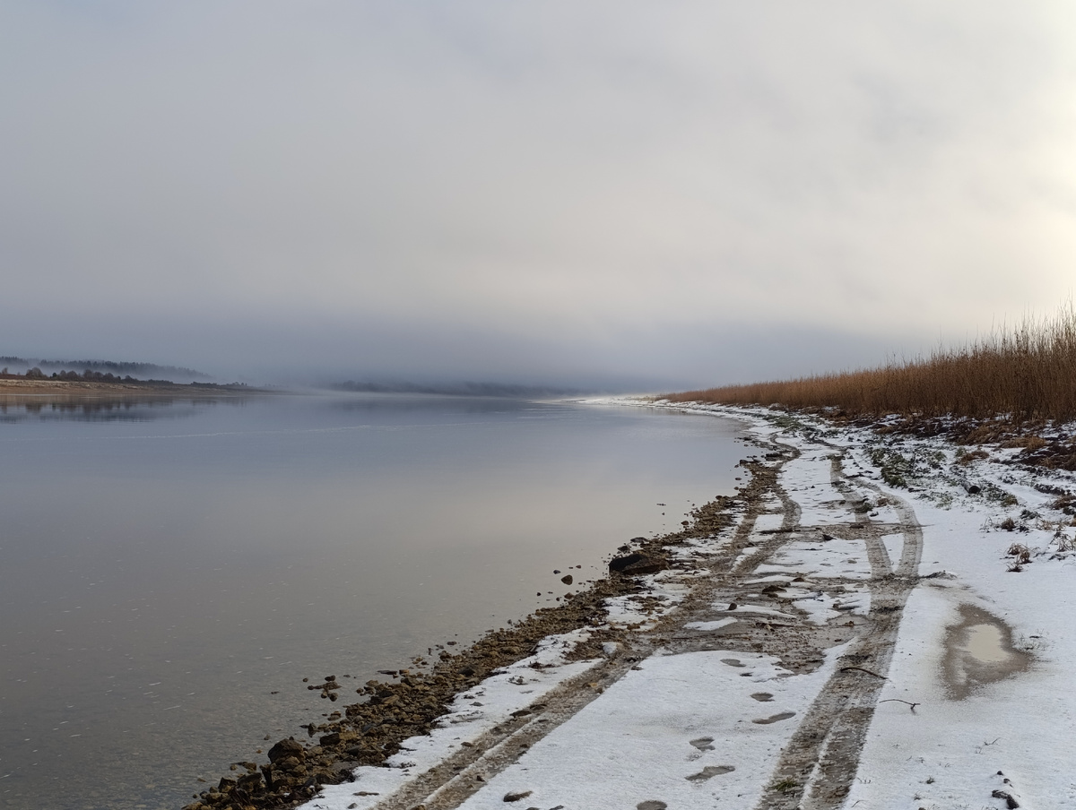 Наступил третий завершающий день нашего не долгого, но замечательного путешествия в другую реальность, не похожую на жизнь в городе. Чтобы помыть посуду надо нагреть воды, чтобы нагреть воды, надо натопить печь, для этого принести дров, и топить печь не чаще чем один раз в день. Я не представляю, как люди живут так постоянно, при отсутствии бойлера. Даже выражение "движение- это жизнь" в условиях сельской местности начинает играть новыми красками. И так вот, переделав все дела в доме, чтобы замести следы нашего присутствия, мы отправились на родник. На этот день в планах было объять необъятное и вернуться хотя бы по сумеркам в Архангельск. Дорога на родник пролегала уже по заснеженному берегу Северной Двины, куда-то в сторону завесы удаляющегося тумана. Постепенно пейзаж менялся. Пески отодвинули от реки растительность, открывая простор взору. Итак, мы вскоре увидели Конду. Небольшая река спешила к Северной Двине, петляя и извиваясь как змея, и пробуравливая себе русло сквозь песчаные
