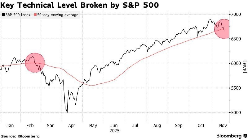 S&P 500 пробил ключевую поддержку впервые за 139 дней 📉⚠️ Американский фондовый индекс S&P 500 закрылся ниже 50-дневной скользящей средней впервые за 139 торговых сессий. Это важный технический сигнал, который указывает на ослабление краткосрочного тренда. Эксперты Morgan Stanley и других аналитических агентств бьют тревогу и прогнозируют возможное падение индекса на 5-10% к концу декабря. Основные причины коррекции - эскалация торговой напряженности между США и Китаем, опасения перегрева рынка и снижение ожиданий по смягчению политики ФРС. Следующая сильная зона поддержки находится на уровне 6350-6400 пунктов. #новости #БезПафосаФинансы #акции #сша