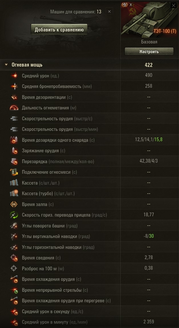 Огневая мощь: Средний урон: 490/490/640 Средняя бронепробиваемость (мм): 258/308/65 Время перезарядки одного снаряда (ов): 12,5/14,1/15,8 Перезагрузка (полная/промежуточная/кол-во): 42,38/4/3 Скорость перемещения башни (град/с): 18,77 Скорость перемещения корпуса (град/с): 18,77 Угол наклона орудия (град): -8/30 Время прицеливания (сек): 2,78 Точность стрельбы на расстоянии 100 м: 0,38 Средний урон в минуту: 2359 Сила (HP): 2900 Броня корпуса (лобовая/боковая/задняя в мм): 250/180/200 Броня башни (лобовая/боковая/задняя, мм): 280/200/200 Время ремонта гусеницы (сек): 12.03 Максимальный вес машины (т): 160 Мощность двигателя (л.с.): 1400 Удельная мощность (л.с./т): 8,75 Максимальная скорость/движение задним ходом (км/ч): 25/15 Маскировка неподвижного транспортного средства (%): 0,86/0,14 Маскировка движущегося транспортного средства (%): 0,46/0,07 Дальность обзора (м): 400 Устойчивость к пересеченной местности: жесткая 1,3 средняя 1,8 мягкая 3,1 Рассеивание оружия: при движении: 0,20