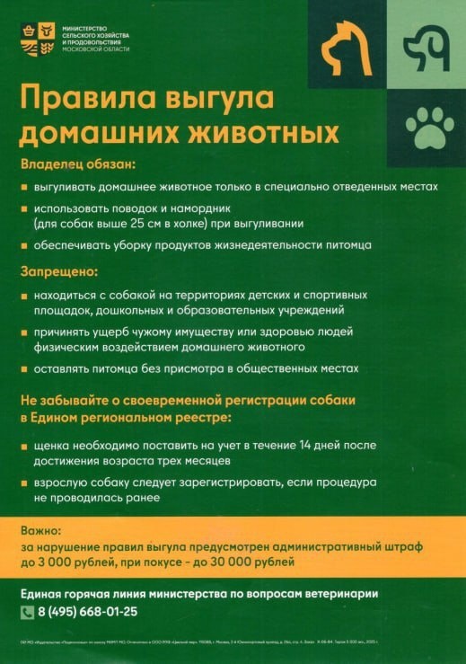 🐕 В Подмосковье действуют правила выгула домашних животных Чтобы во дворах и на общественных территориях было безопасно и комфортно для всех, в округе оборудованы специальные места для выгула домашних животных. Напоминаем основные требования, которые действуют на территории Подмосковья. 📍Владелец обязан: ⏺ Выгуливать питомца только в специально отведённых местах; ⏺ Использовать поводок, а при необходимости намордник; ⏺ Убирать за своим животным, сохраняя чистоту в общественных пространствах. ❌ Запрещено: ⏺ Находиться с собакой на детских и спортивных площадках, территориях школ и детсадов; ⏺ Оставлять животное без присмотра; ⏺ Допускать причинение ущерба имуществу или вред здоровью людей. 🐶Также напоминаем: Все владельцы обязаны зарегистрировать своих питомцев, это помогает поддерживать порядок и обеспечивает безопасность в округе. Соблюдая простые правила, мы делаем наши дворы чище, спокойнее и безопаснее 😊Онлайн эфир 😊Мы в ВК 😊Подписаться